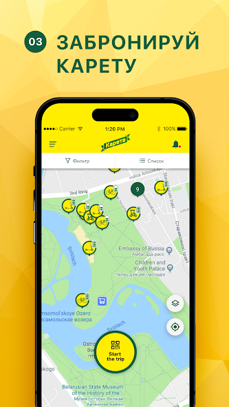 Transporte de ciclo turístico automatizado " Карета " para territórios locais - um serviço para alugar carros de bicicleta familiar por meio de um aplicativo móvel com a função de construir rotas turísticas com o guia de áudio.